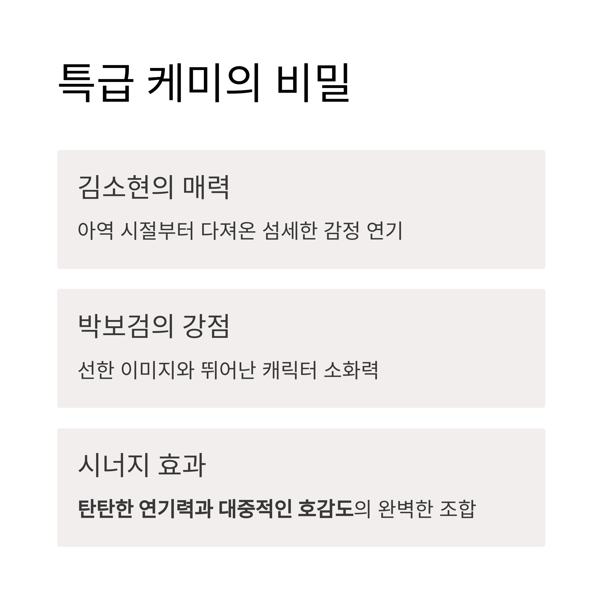 위 표에서 볼 수 있듯이, 김소현과 박보검 배우는 각기 다른 매력을 지니고 있지만, 오히려 그 다름이 만나 더욱 강력한 시너지를 발휘할 것으로 기대됩니다.