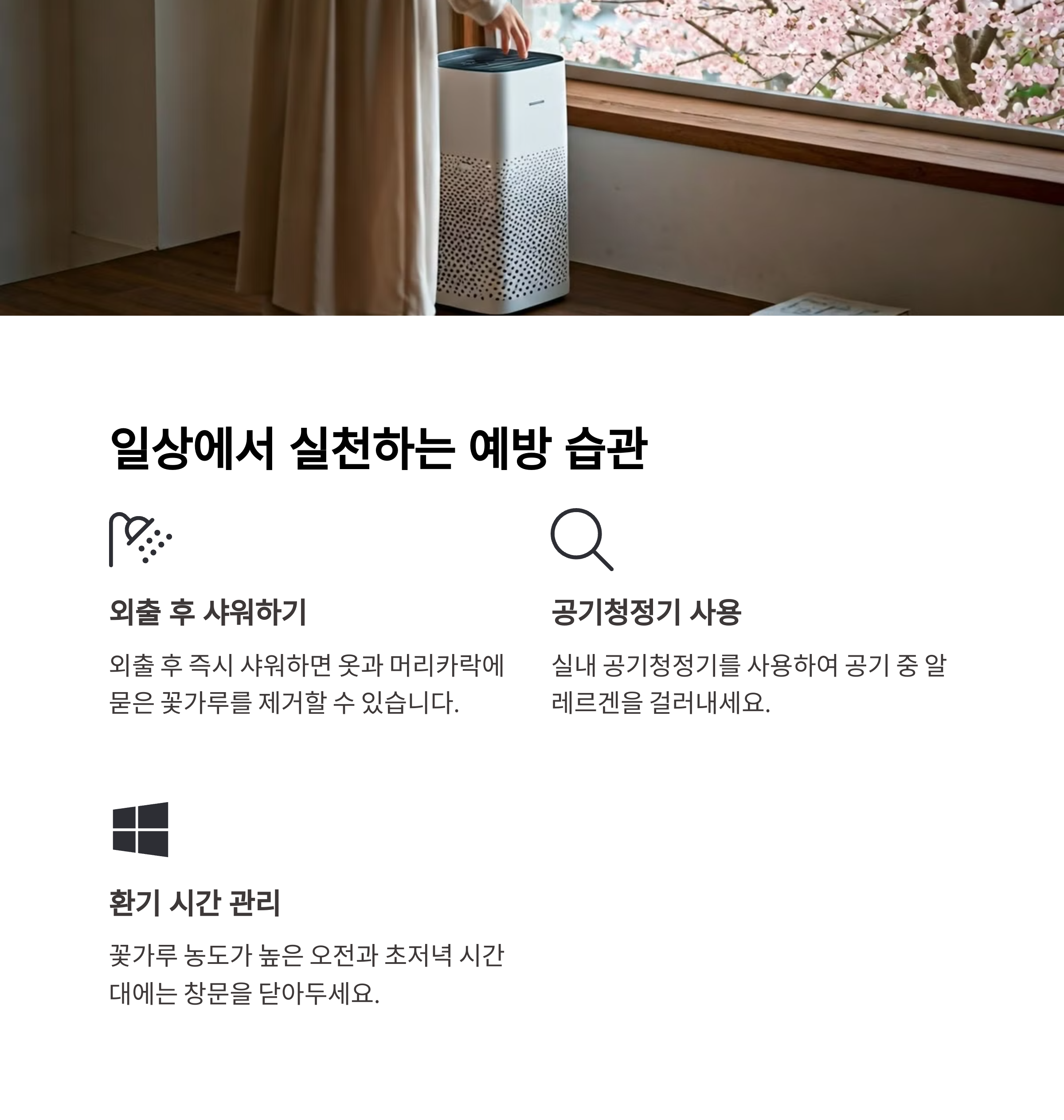 이 방법들은 증상 완화에 도움을 주지만, 꽃가루 노출을 최소화하는 환경 관리(창문 닫기, 공기청정기 사용 등)와 병행해야 효과가 극대화됩니다.