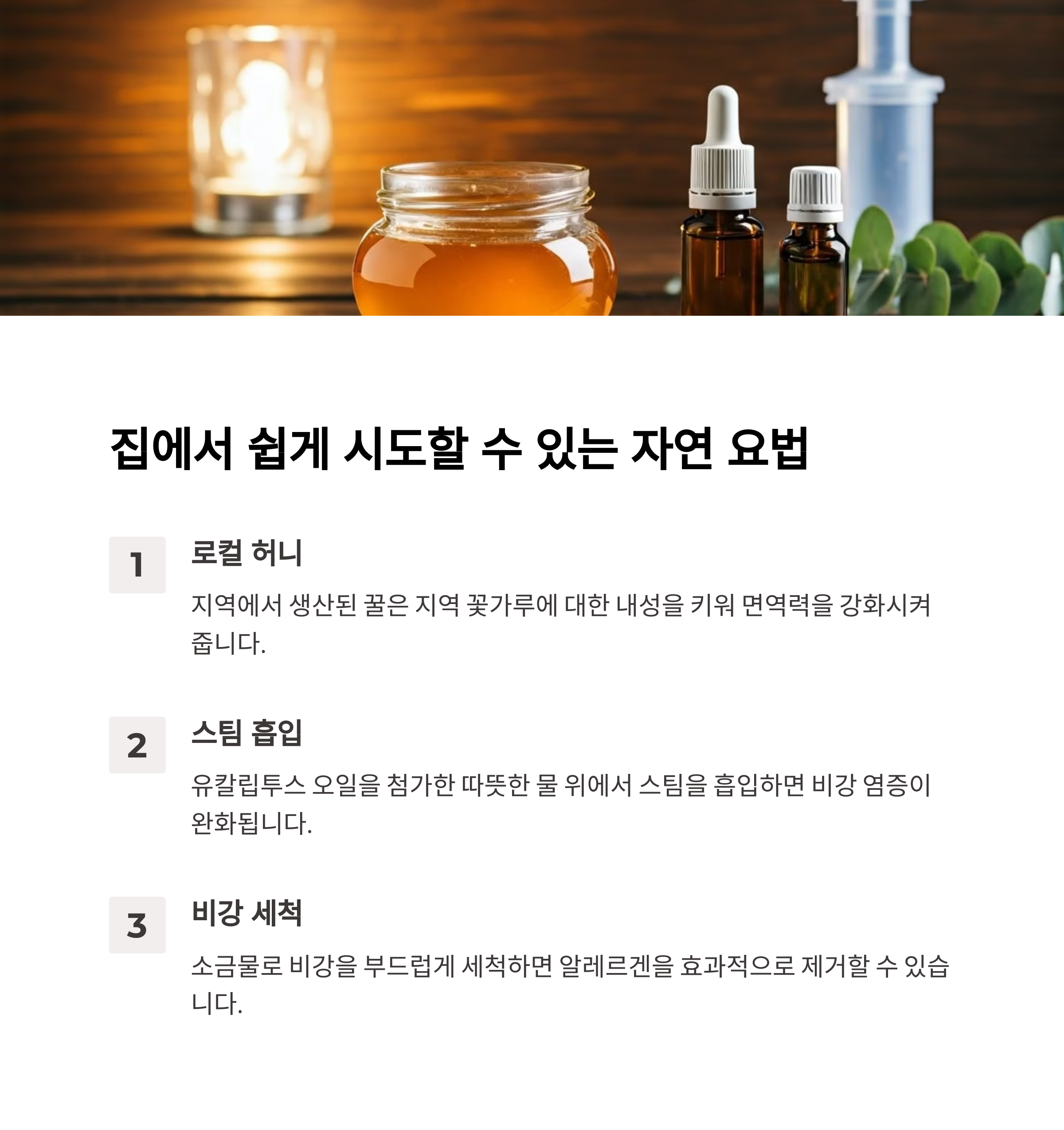 대표적인 자연 요법 중 하나는 로컬 허니 섭취입니다. 지역에서 생산된 꿀을 꾸준히 섭취하면 몸이 해당 지역의 꽃가루에 대한 내성을 키울 수 있습니다. 또한 유칼립투스 오일을 사용한 스팀 흡입은 비강 염증을 완화하고 호흡을 원활하게 해주는 효과가 있습니다. 알레르기 증상이 심할 경우, 소금물로 비강을 세척하는 것도 좋은 방법입니다.