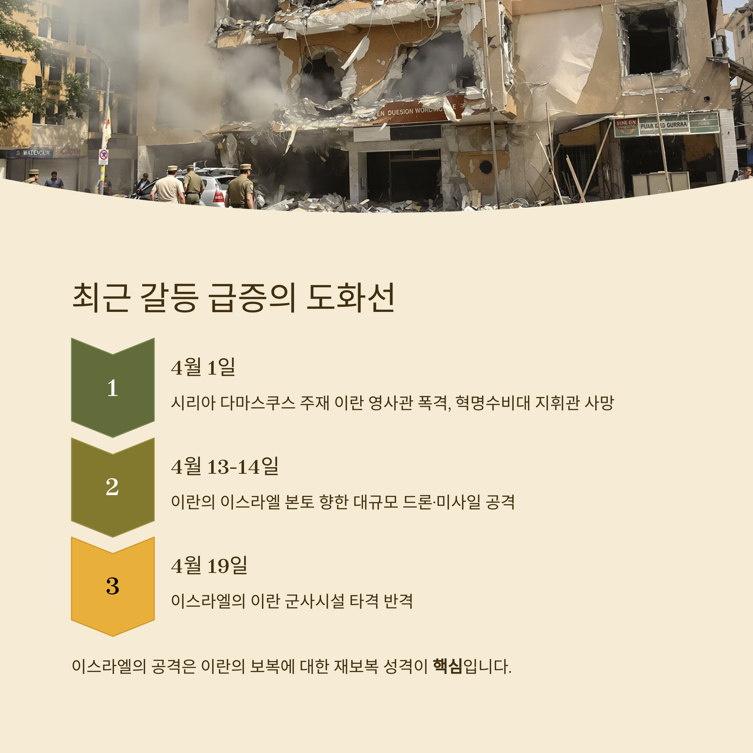 최근 이스라엘과 이란 간의 긴장은 일련의 사건들을 통해 최고조에 달했습니다. 시간을 거슬러 올라가 보면, 4월 1일 시리아 주재 이란 영사관이 공격받아 이란 혁명수비대의 주요 인물들이 사망하는 사건이 발생했습니다. 이는 중요한 전환점이었습니다. 이후 4월 13일 밤부터 14일 새벽 사이, 이란은 이스라엘을 향해 대규모 드론 및 미사일 공격을 감행하며 보복에 나섰습니다. 그리고 며칠 뒤인 4월 19일, 이스라엘이 이란 내 군사 시설 등을 목표로 제한적인 공격을 단행했다는 보도가 이어졌습니다. 이러한 일련의 사건들은 중동 지역의 평화와 안정을 위협하는 필수적으로 주목해야 할 전개입니다.