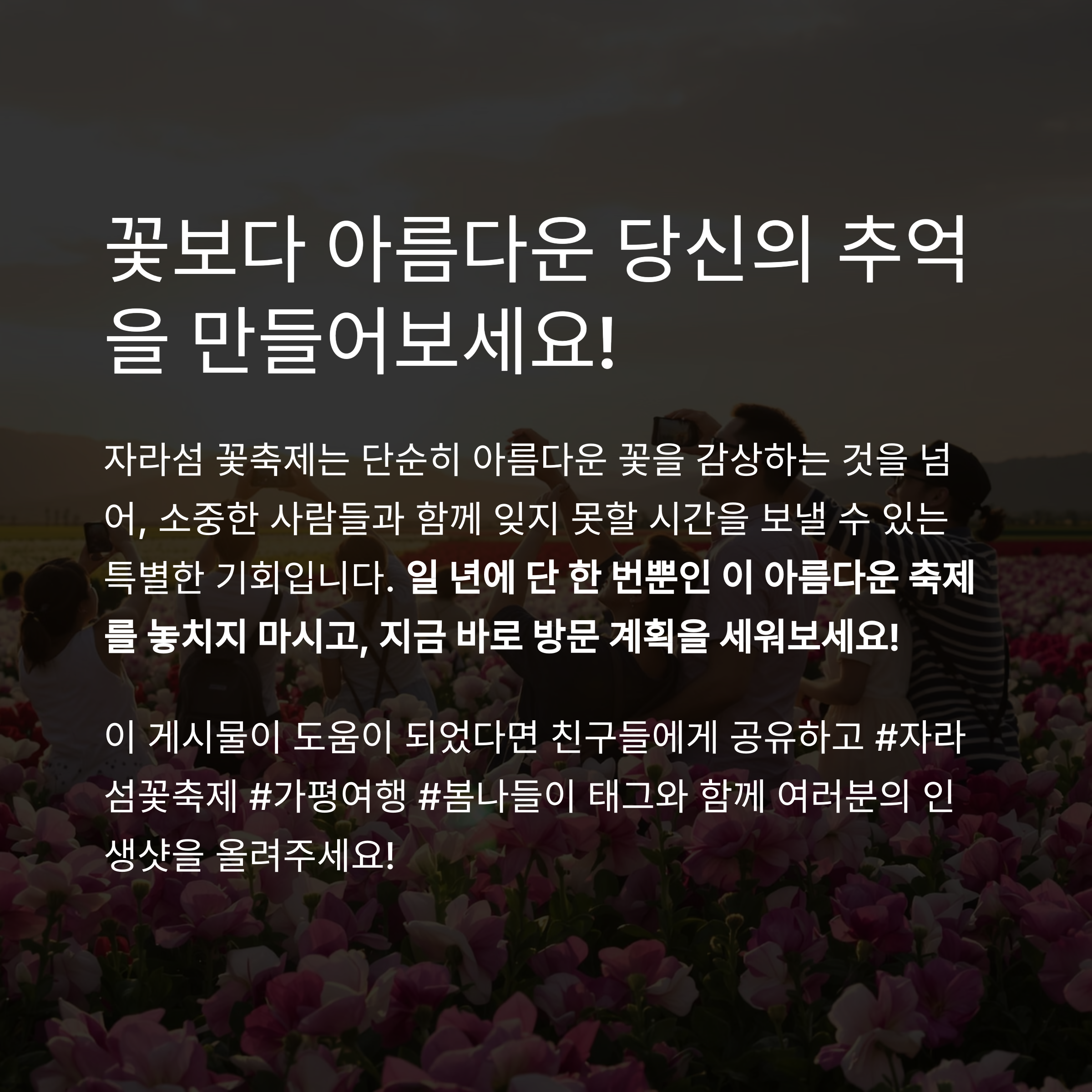 자라섬 꽃축제는 단순히 아름다운 꽃을 감상하는 것을 넘어, 소중한 사람들과 함께 잊지 못할 시간을 보낼 수 있는 특별한 기회를 제공합니다.