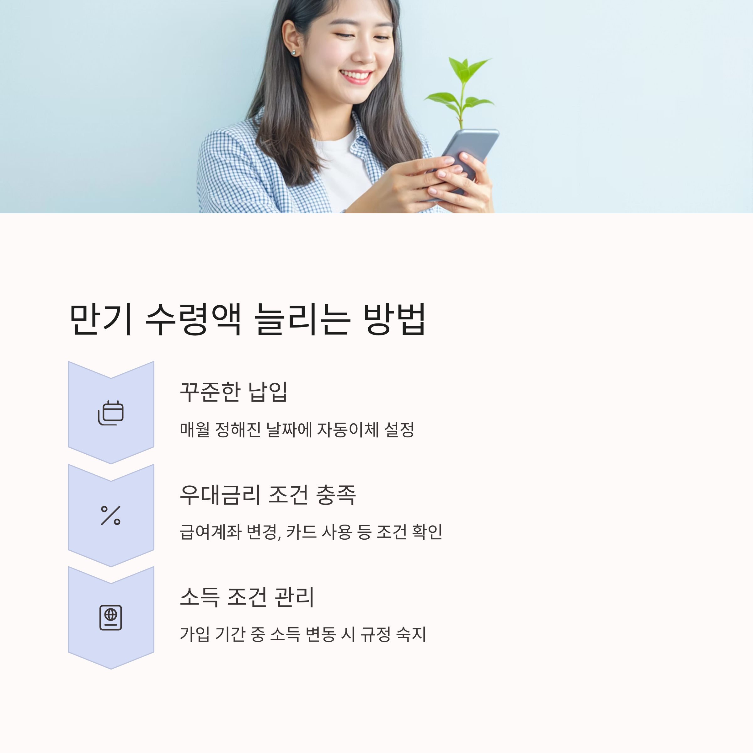 - 이자 발생 및 우대금리 관리 (가입 기간 내내): 약정된 이율에 따라 이자 발생, 우대금리 조건 유지 노력.