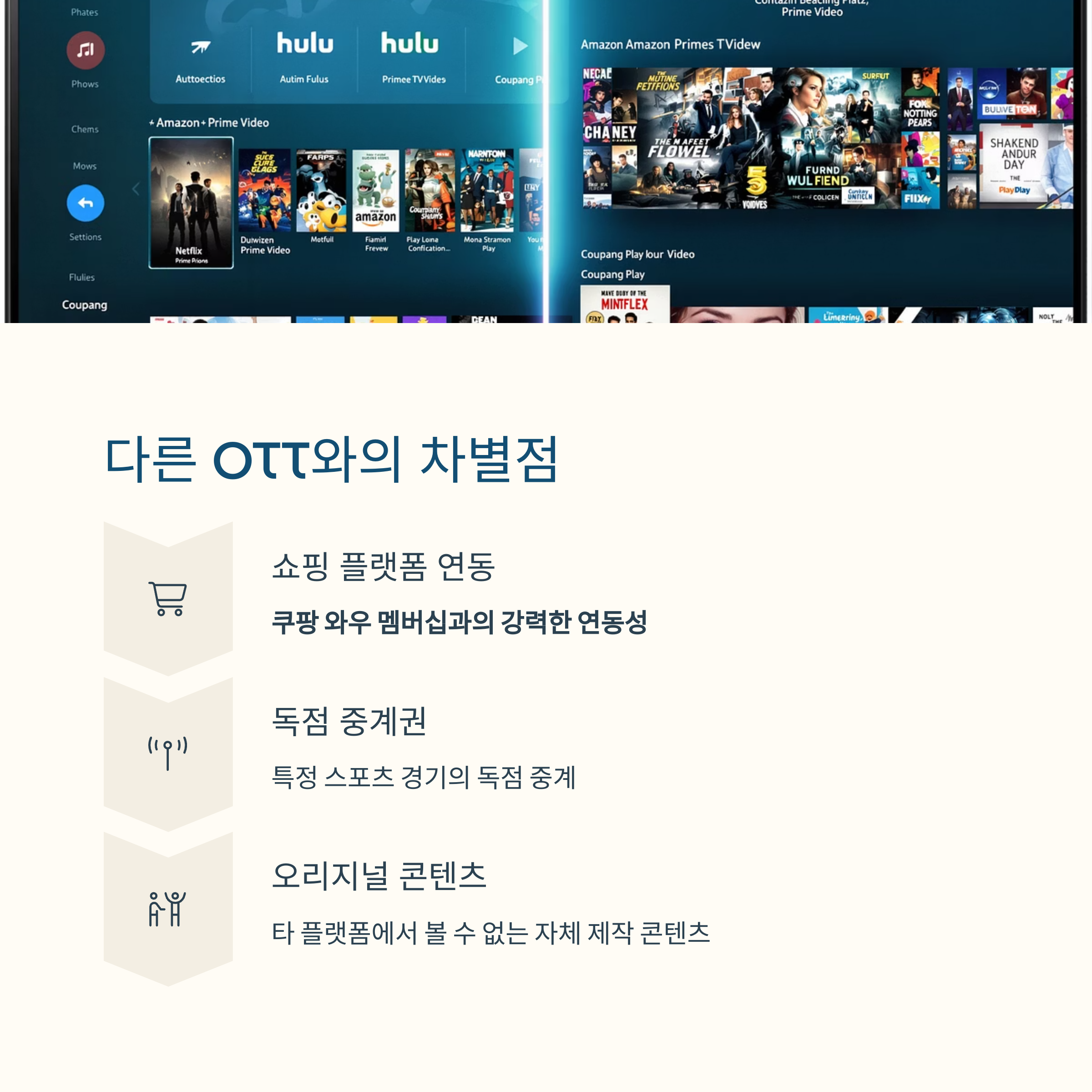 쿠팡플레이는 다른 OTT 서비스와 비교했을 때 몇 가지 뚜렷한 차별점을 가지고 있습니다.