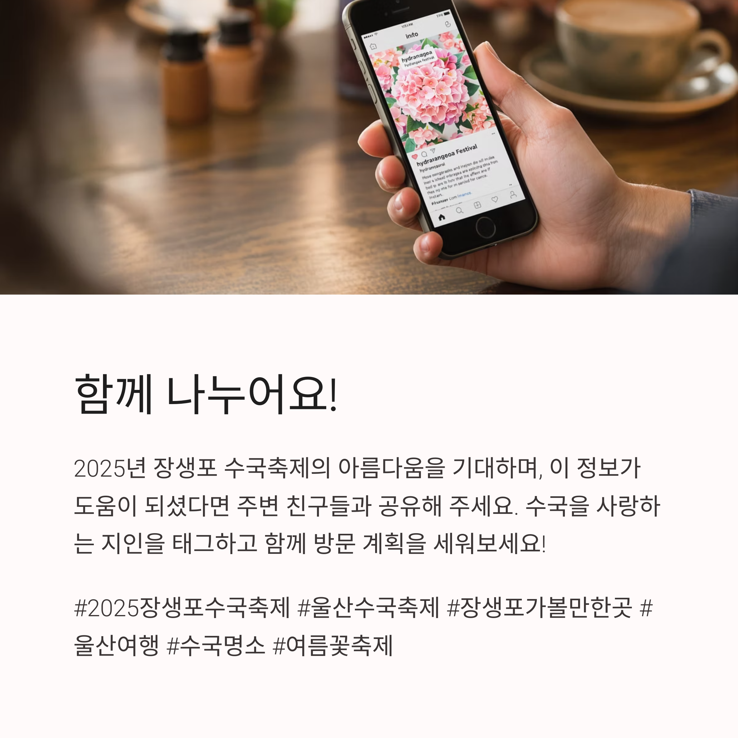 - 수국 외 즐길 거리도 확인하기: 장생포에는 고래박물관, 고래생태체험관 등 다양한 볼거리가 함께 있습니다. 수국 감상과 더불어 다른 체험도 함께 계획해 보세요.